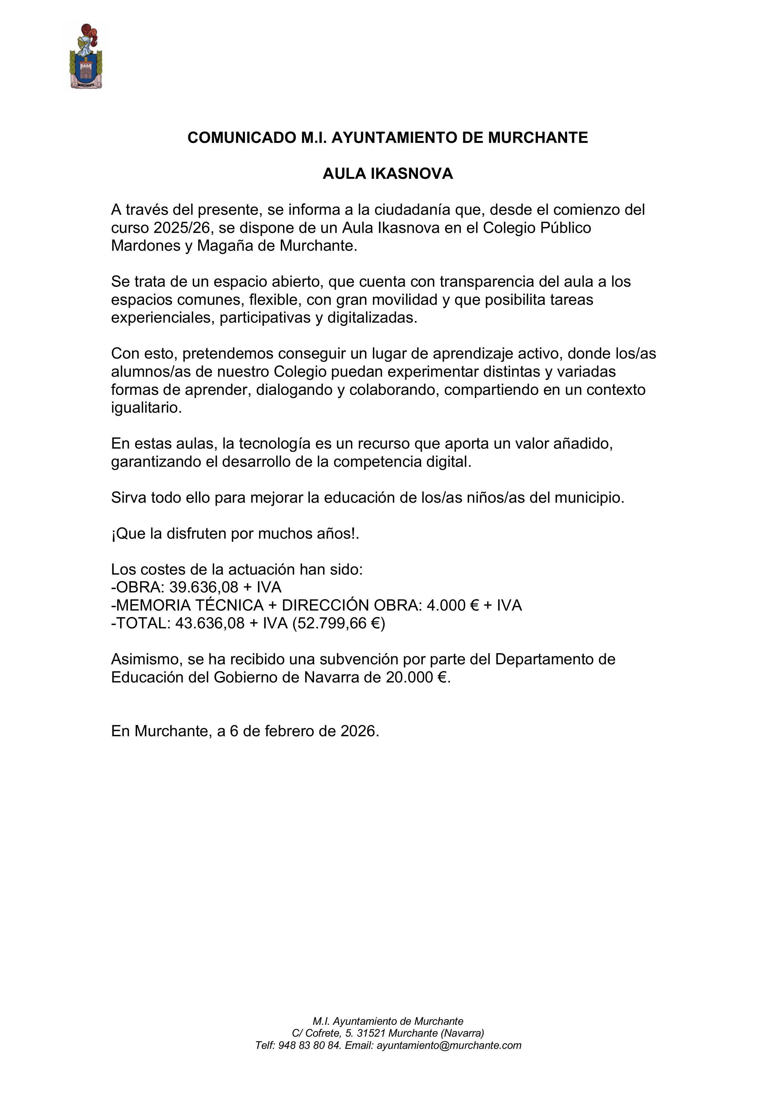 A través del presente, se informa a la ciudadanía que, desde el comienzo del curso 2025/26, se dispone de un Aula Ikasnova en el Colegio Público Mardo...