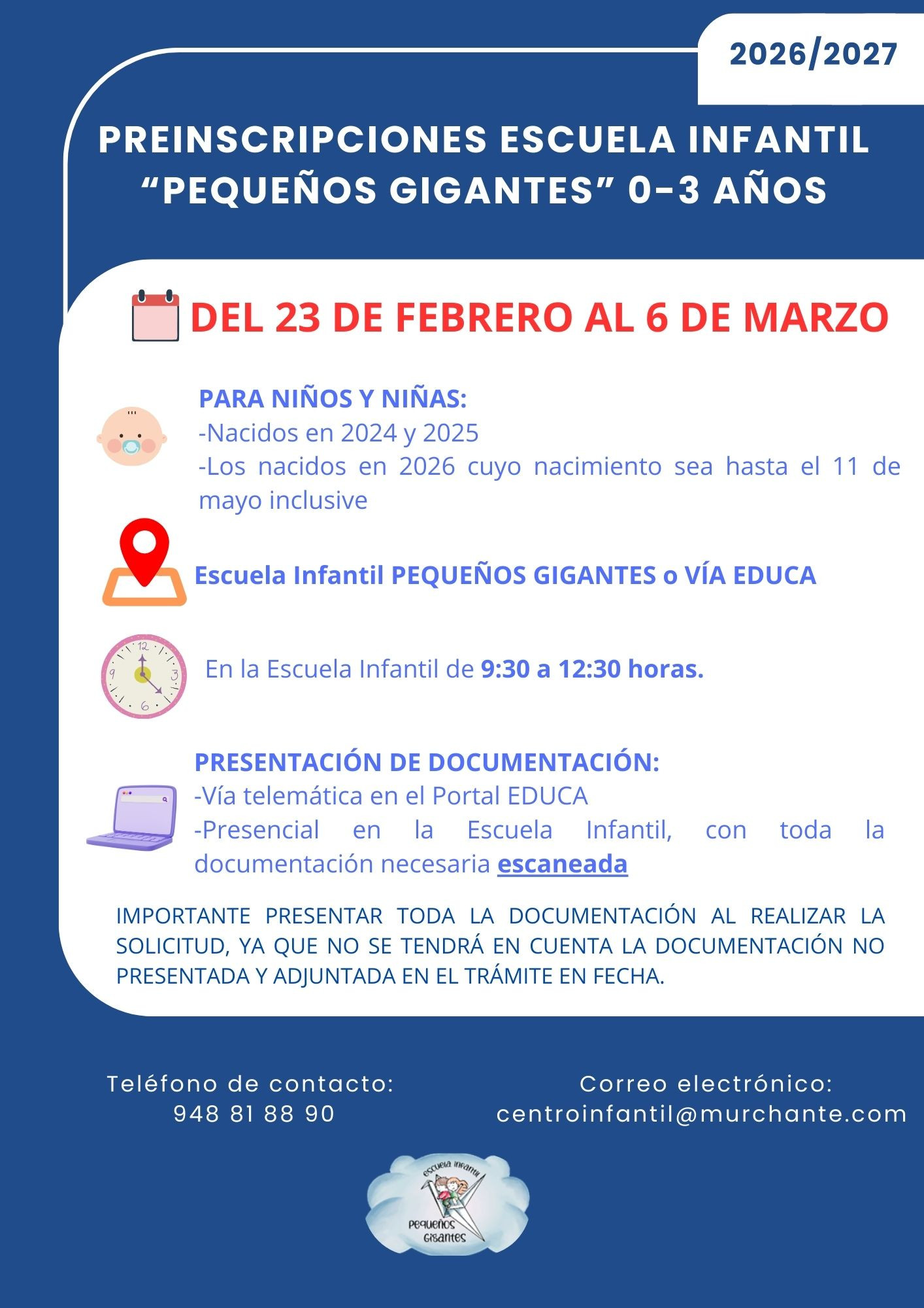 PLAZO DE PRESENTACIÓN DE SOLICITUDES PARA EL PRIMER CICLO DE EDUCACIÓN INFANTIL: DEL 23 DE FEBRERO AL 6 DE MARZO