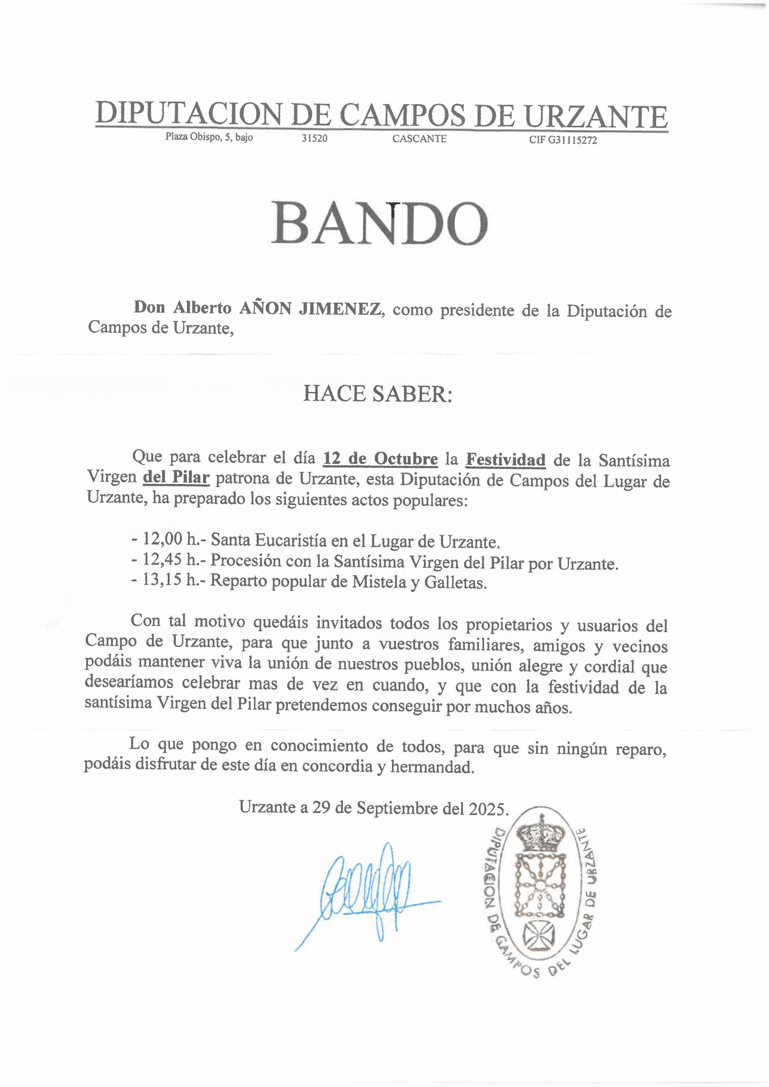13:15 Reparto de mistela y galletas.