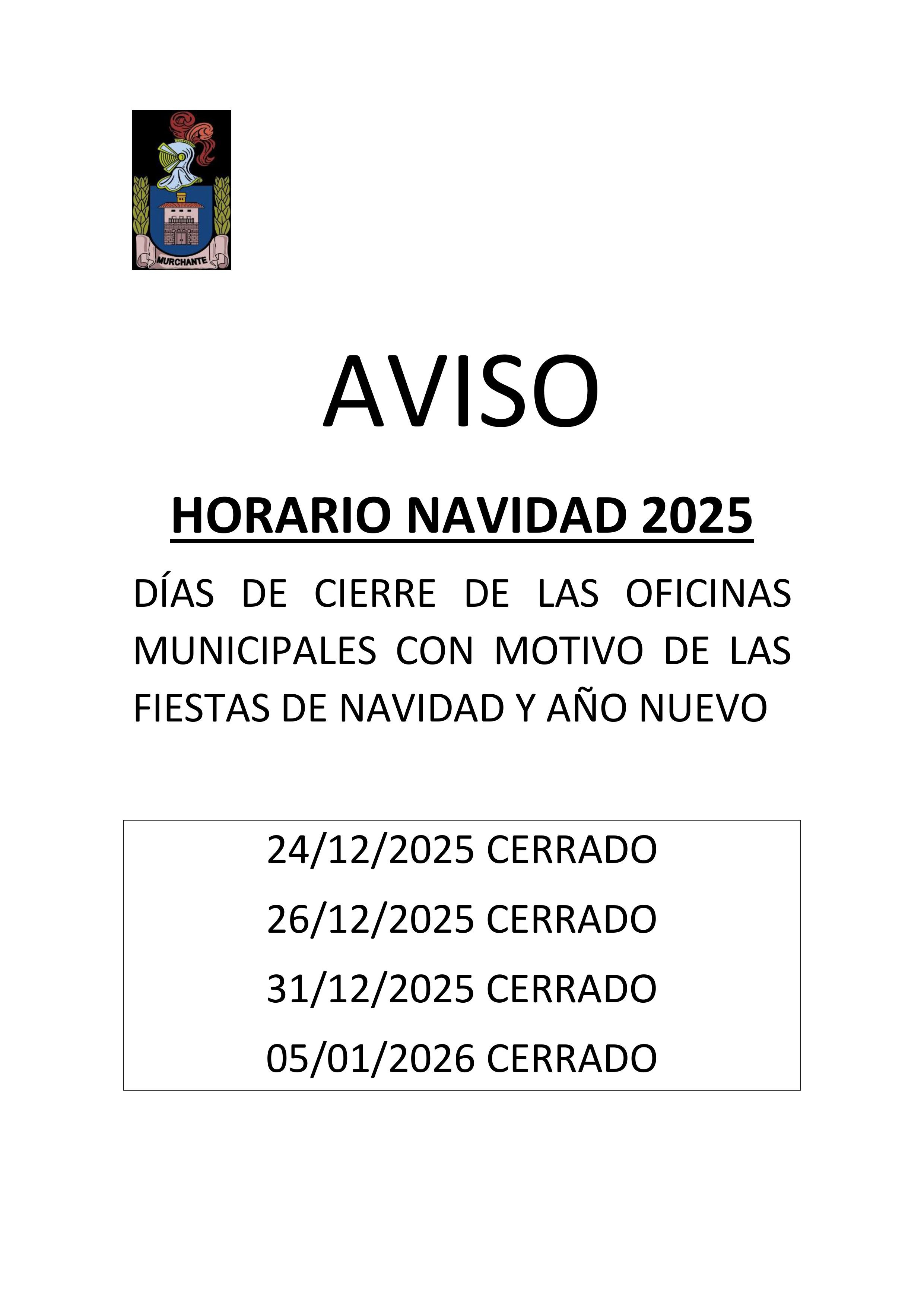 HORARIO NAVIDAD 2025: DÍAS DE CIERRE DE LAS OFICINAS MUNICIPALES CON MOTIVO DE LAS FIESTAS DE NAVIDAD Y AÑO NUEVO