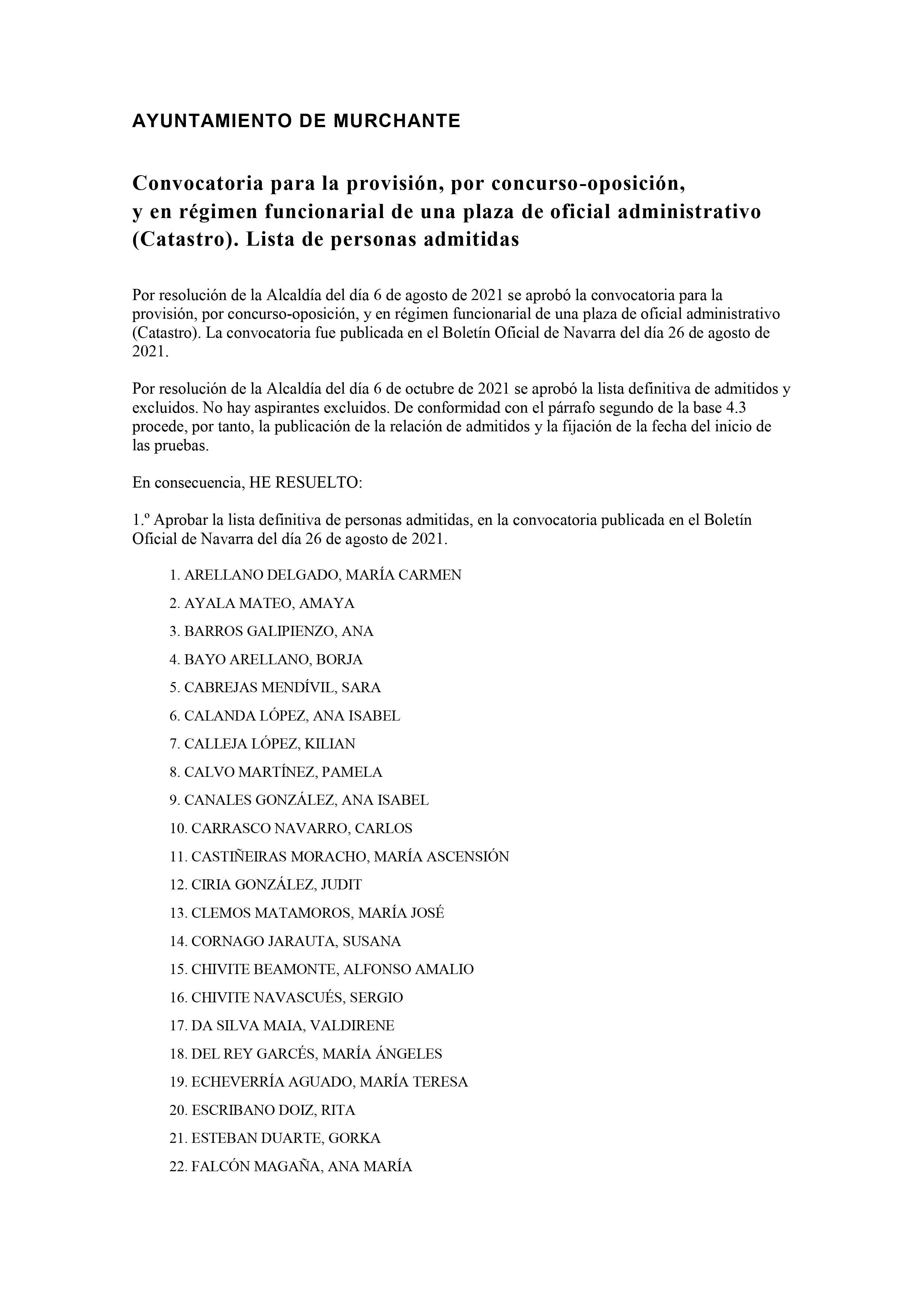 Por resolución de la Alcaldía del día 6 de agosto de 2021 se aprobó la convocatoria para la provisión, por concurso-oposición, y en régimen funcionarial de una plaza de oficial administrativo (Catastro). La convocatoria fue publicada en el Boletín Oficial de Navarra del día 26 de agosto de 2021.