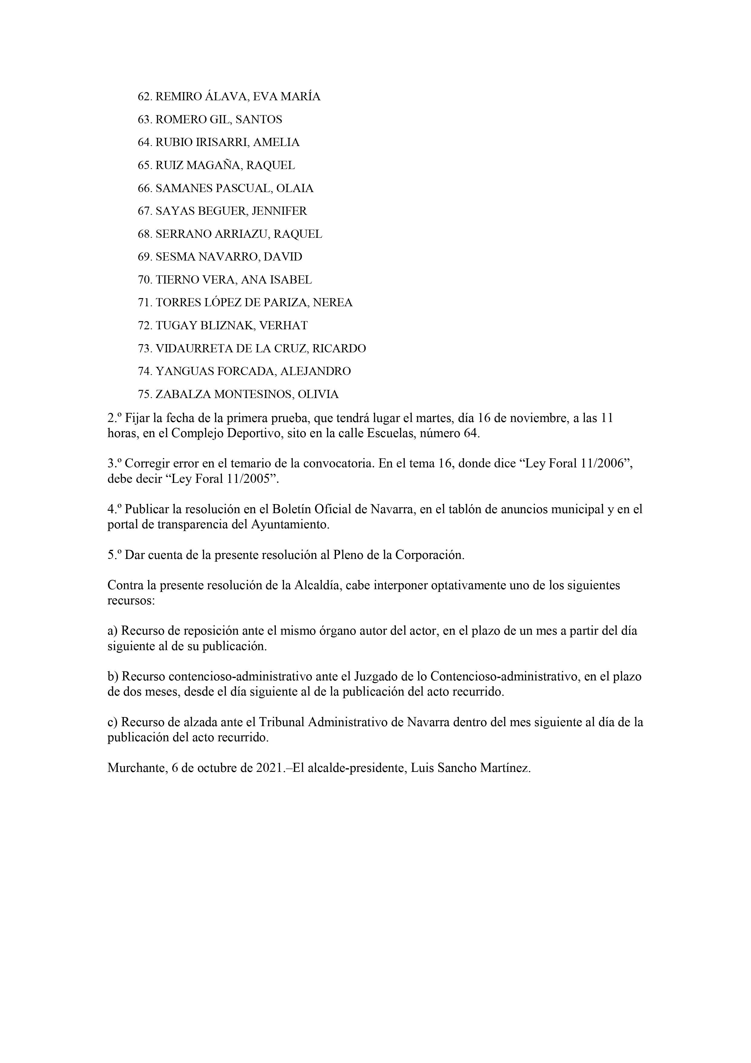Por resolución de la Alcaldía del día 6 de octubre de 2021 se aprobó la lista definitiva de admitidos y excluidos. No hay aspirantes excluidos. De conformidad con el párrafo segundo de la base 4.3 procede, por tanto, la publicación de la relación de admitidos y la fijación de la fecha del inicio de las pruebas.