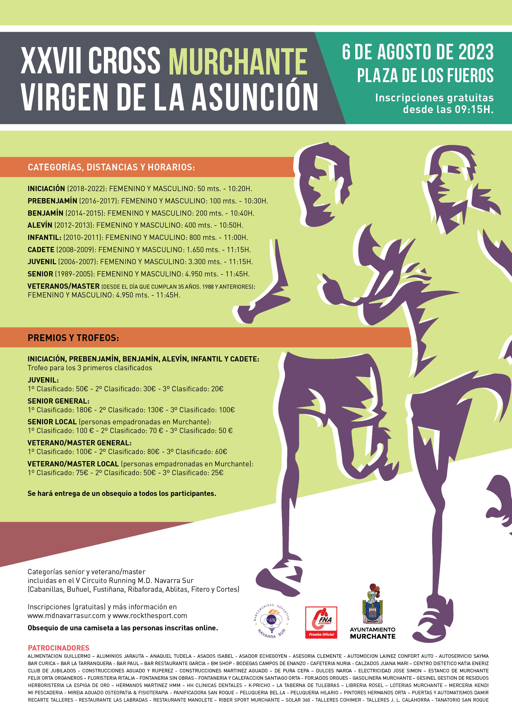 1. El M.I. Ayuntamiento de Murchante, en colaboración con empresas patrocinadoras, organiza el XXVII Cross Virgen de la Asunción. La prueba está sujeta a la normativa de la Federación Navarra de Atletismo y al Reglamento del VI Circuito Running Mancomunidad Deportiva Navarra Sur.