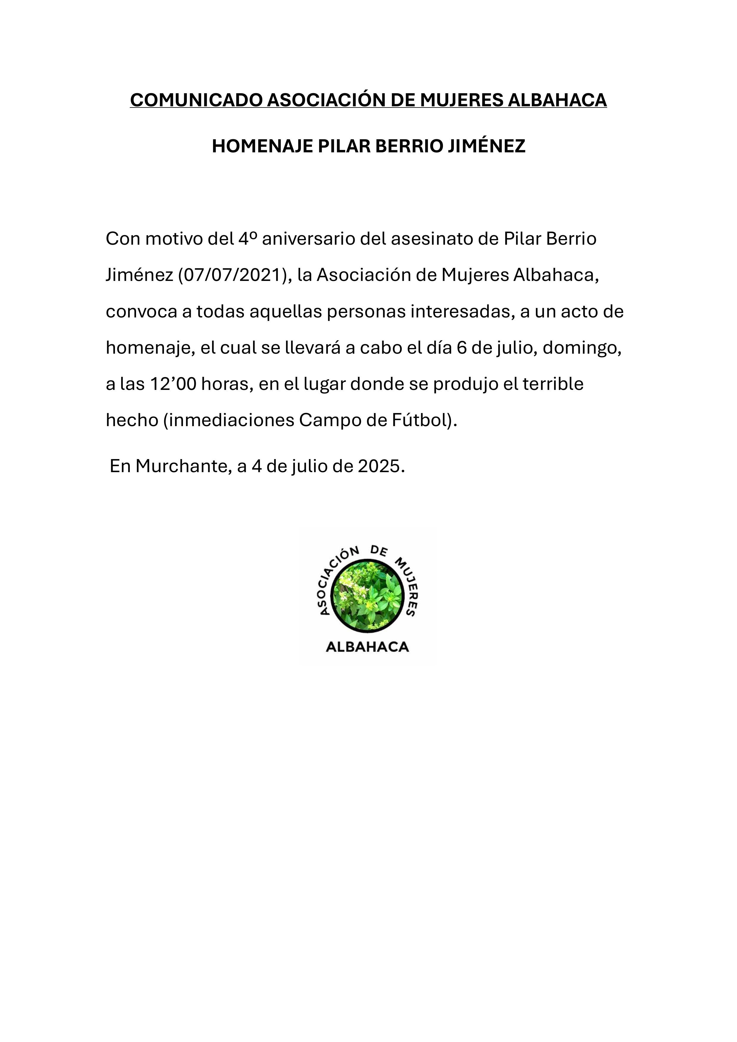 Con motivo del 4º aniversario del asesinato de Pilar Berrio Jiménez (07/07/2021), la Asociación de Mujeres Albahaca, convoca a todas aquellas personas interesadas, a un acto de homenaje, el cual se llevará a cabo el día 6 de julio, domingo, a las 12’00 horas, en el lugar donde se produjo el terrible hecho (inmediaciones Campo de Fútbol).