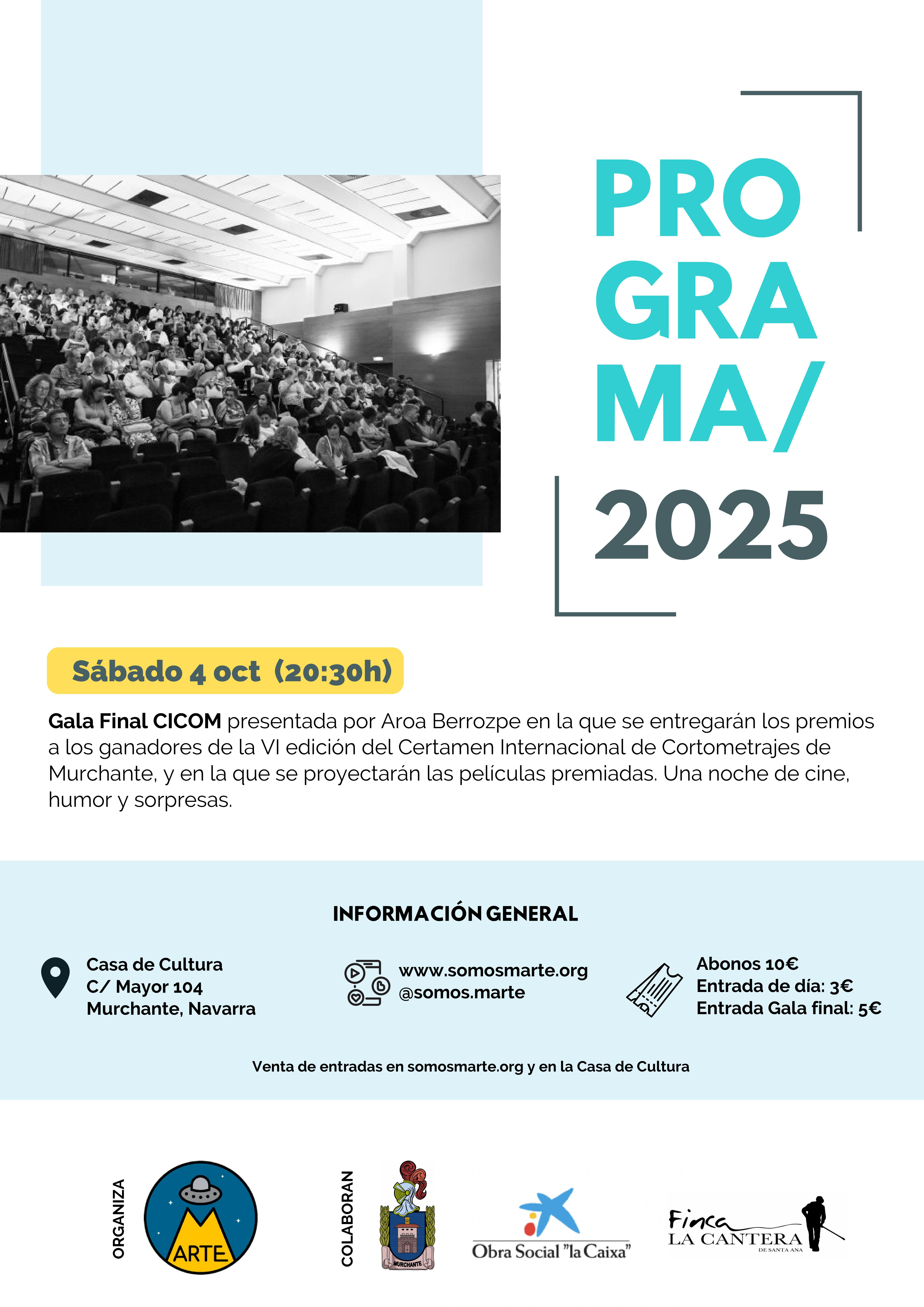 Gala Final CICOM presentada por Aroa Berrozpe en la que se entregarán los premios a los ganadores de la VI edición del Certamen Internacional de Cortometrajes de Murchante, y en la que se proyectarán las películas premiadas. Una noche de cine, humor y sorpresas.