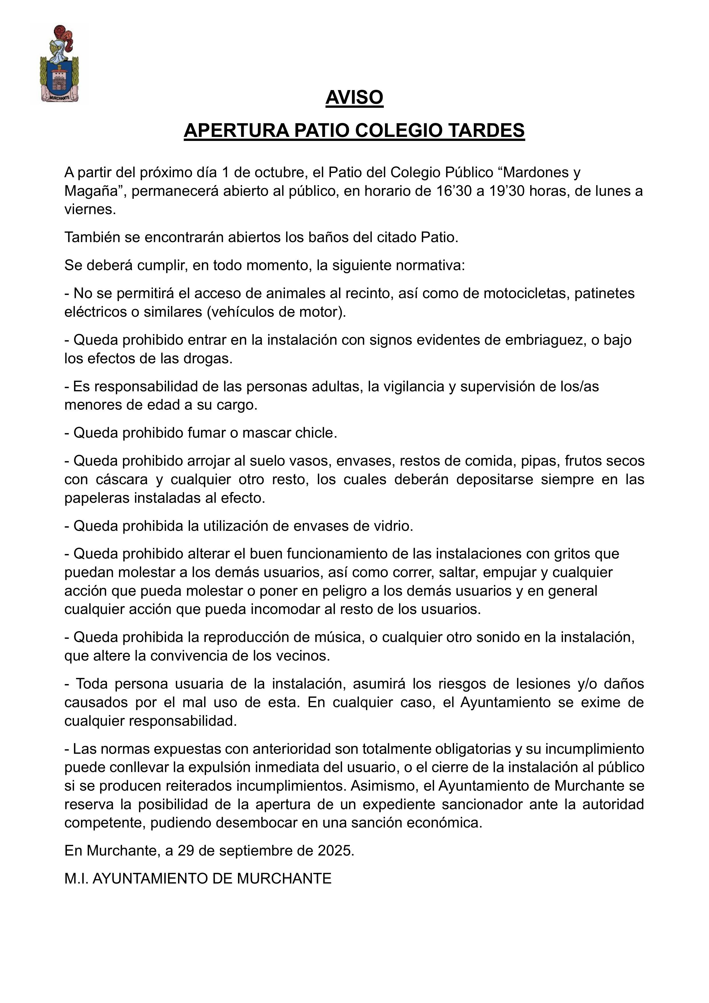 A partir del próximo día 1 de octubre, el Patio del Colegio Público “Mardones y Magaña”, permanecerá abierto al público, en horario de 16’30 a 19’30 horas, de lunes a viernes. También se encontrarán abiertos los baños del citado Patio.