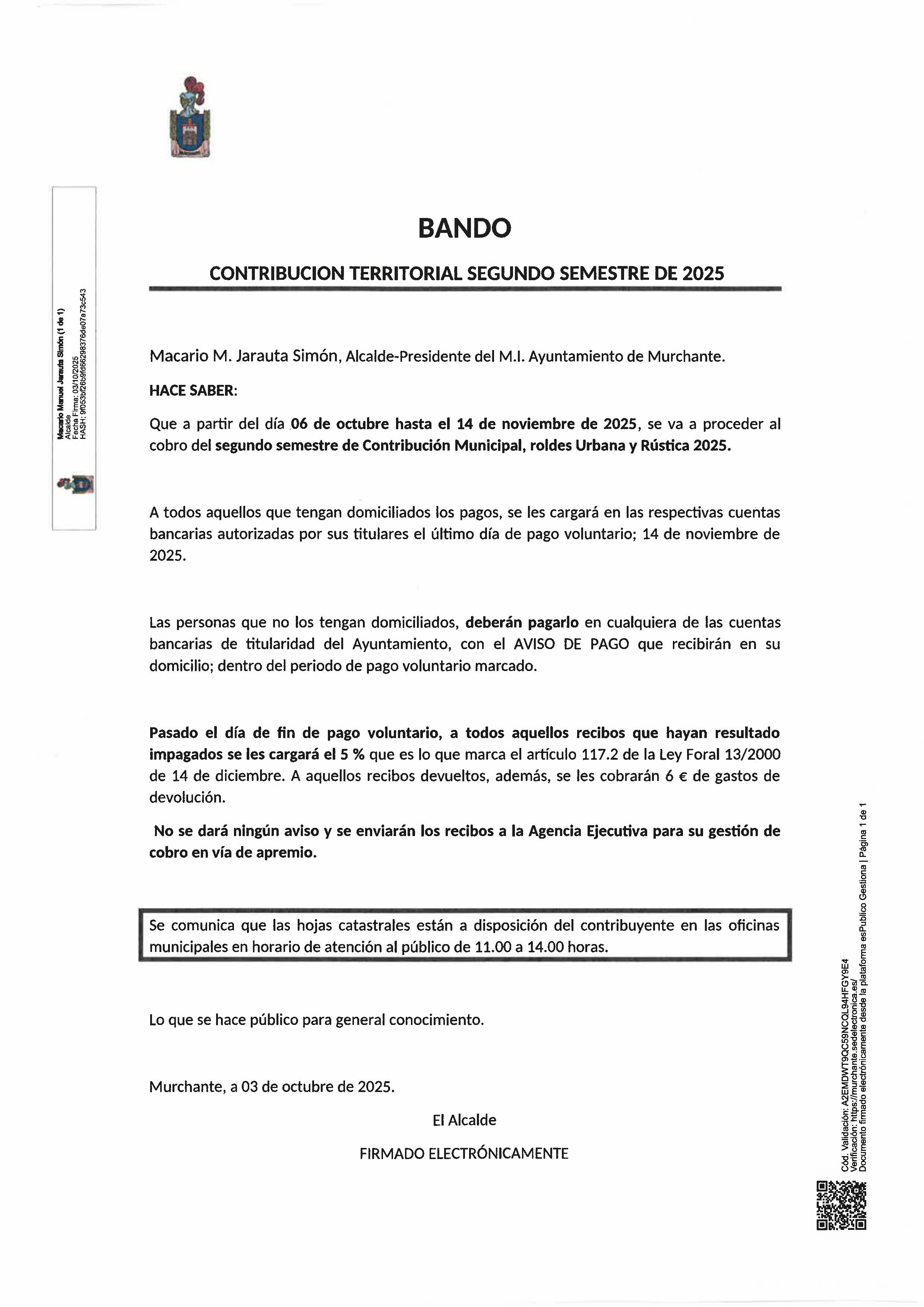 A partir del día 06 de octubre hasta el 14 de noviembre de 2025, se va a proceder al cobro del segundo semestre de Contribución Municipal, roldes Urbana y Rústica 2025.