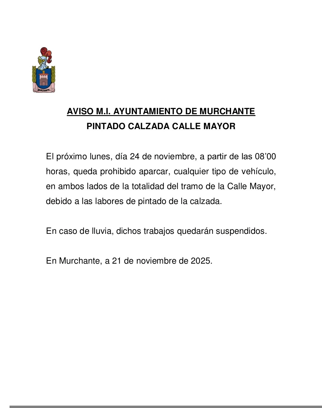 Este lunes, 24 de noviembre, no se podrá aparcar en la calle Mayor por labores de pintado.