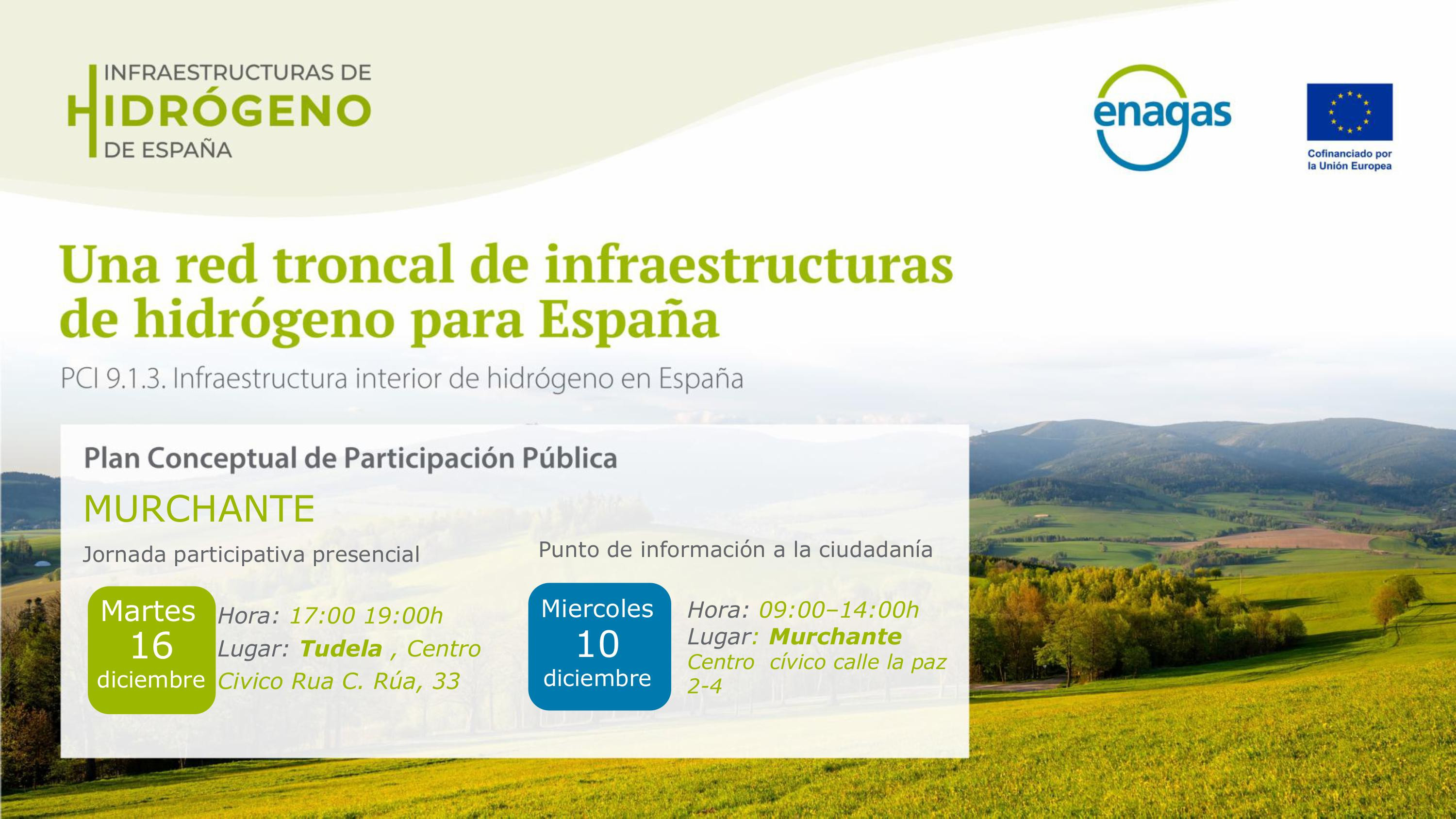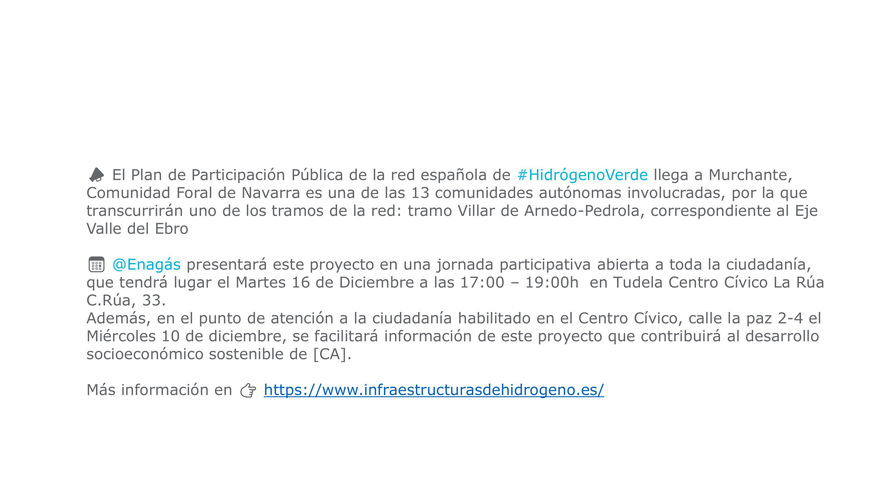 El Plan de Participación Pública de la red española de #HidrógenoVerde llega a Murchante, Comunidad Foral de Navarra es una de las 13 comunidades autónomas involucradas, por la que transcurrirán uno de los tramos de la red: tramo Villar de Arnedo-Pedrola, correspondiente al Eje Valle del Ebro.