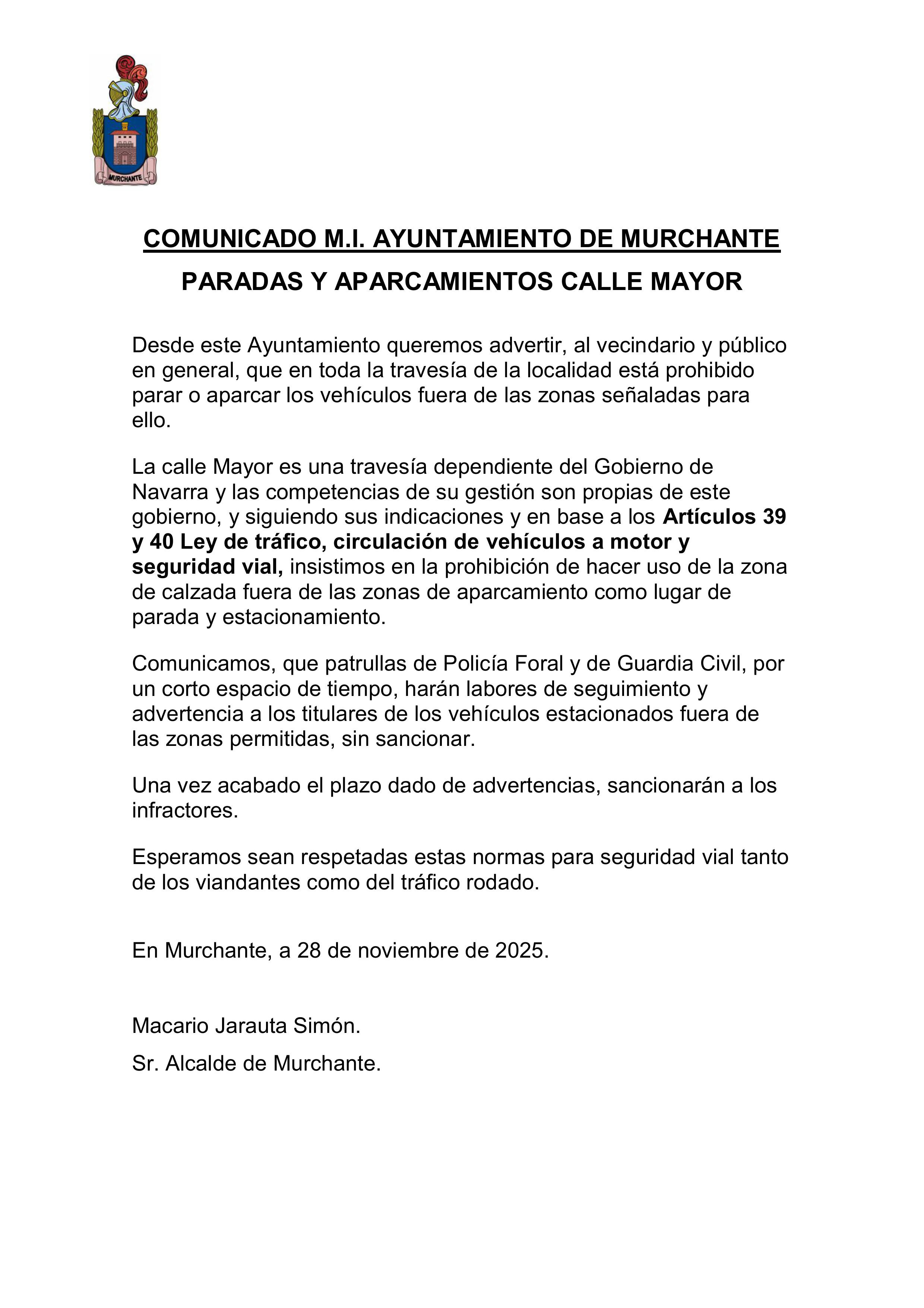 La calle Mayor es una travesía dependiente del Gobierno de Navarra y las competencias de su gestión son propias de este gobierno, y siguiendo sus indicaciones y en base a los Artículos 39 y 40 Ley de tráfico, circulación de vehículos a motor y seguridad vial, insistimos en la prohibición de hacer uso de la zona de calzada fuera de las zonas de aparcamiento como lugar de parada y estacionamiento.