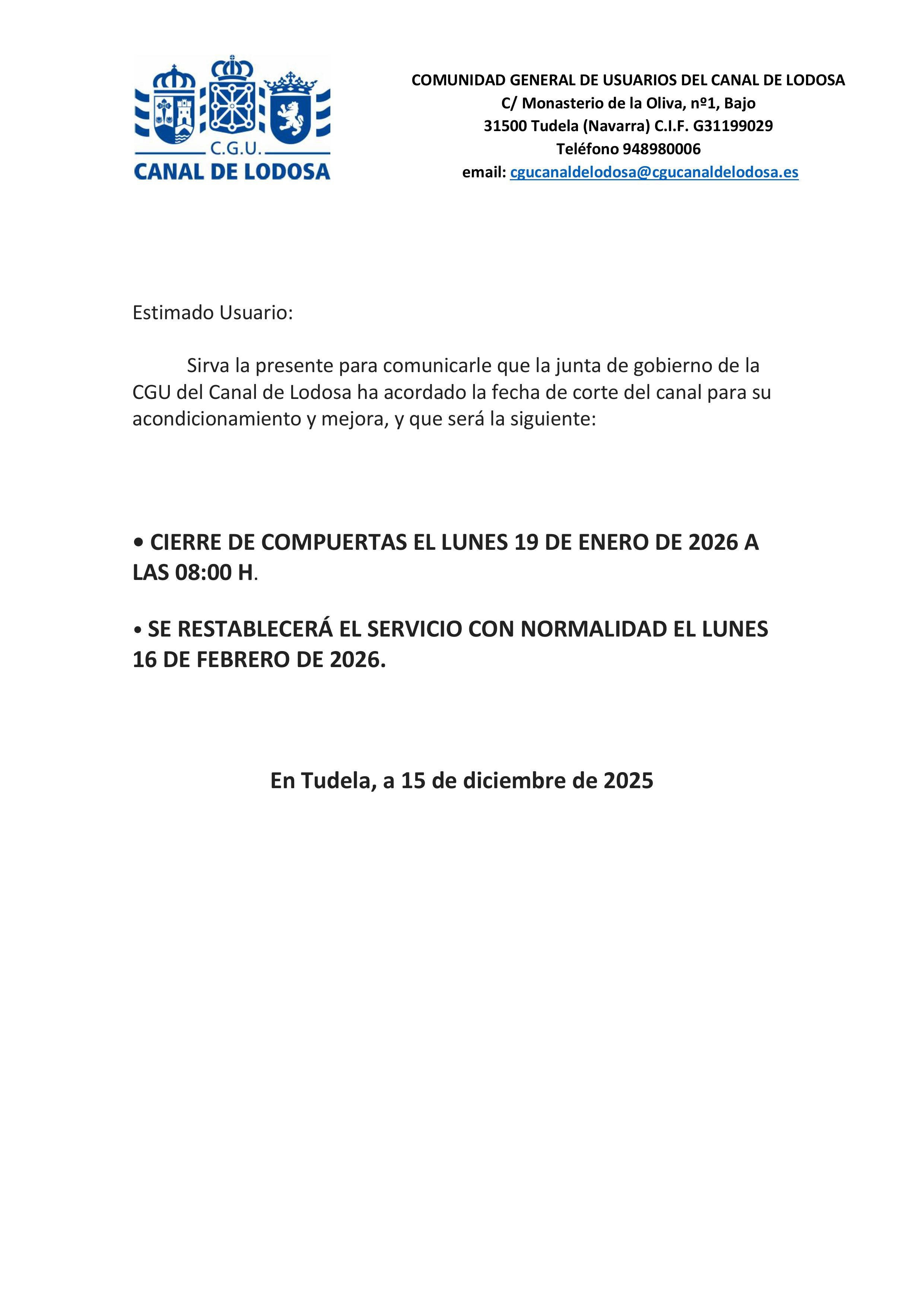 La junta de gobierno de la CGU del Canal de Lodosa ha acordado la fecha de corte del canal para su acondicionamiento y mejora, y que será la siguiente: