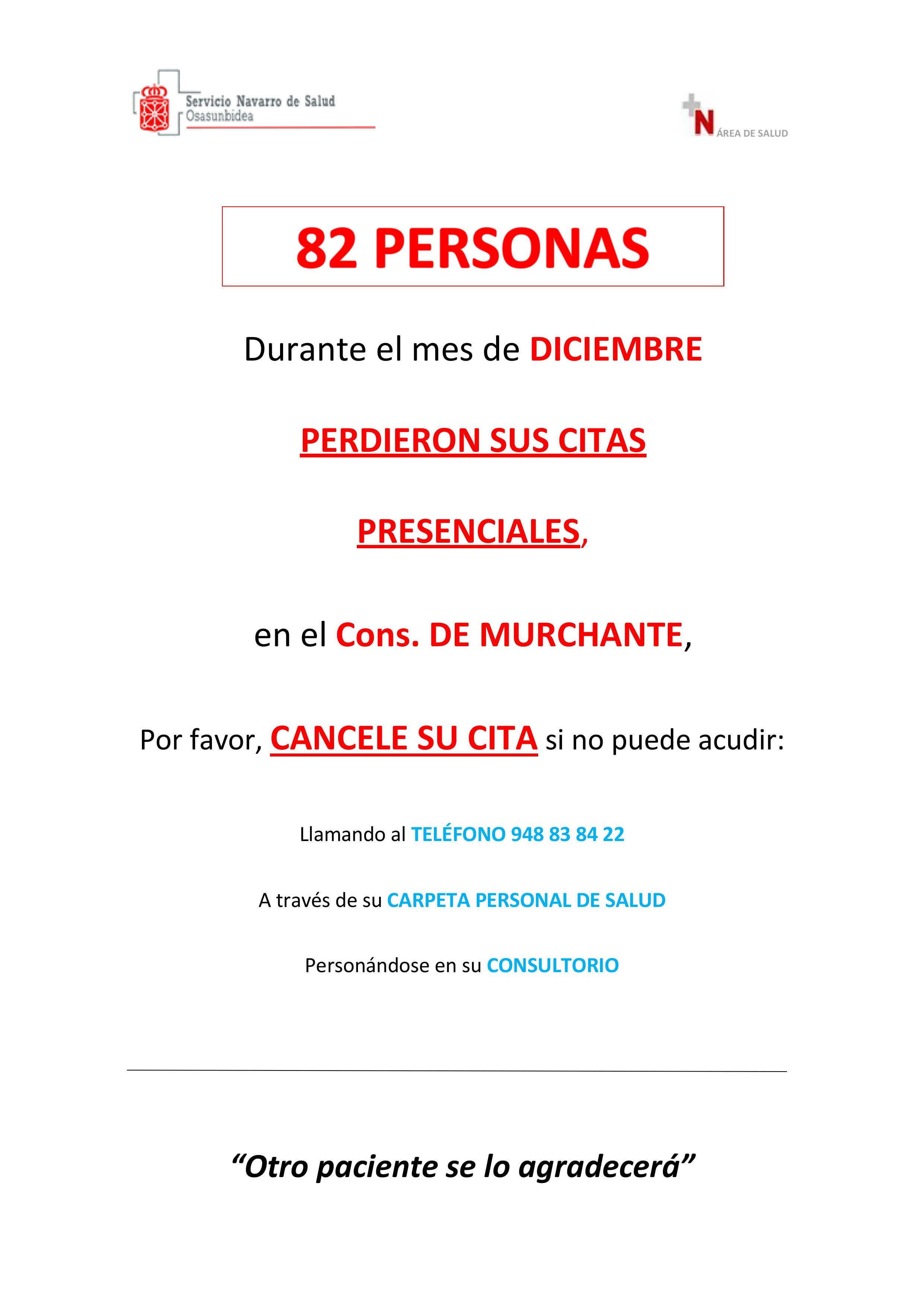 Durante el mes de DICIEMBRE 82 PERSONAS PERDIERON SUS CITAS PRESENCIALES, en el Cons. DE MURCHANTE.
