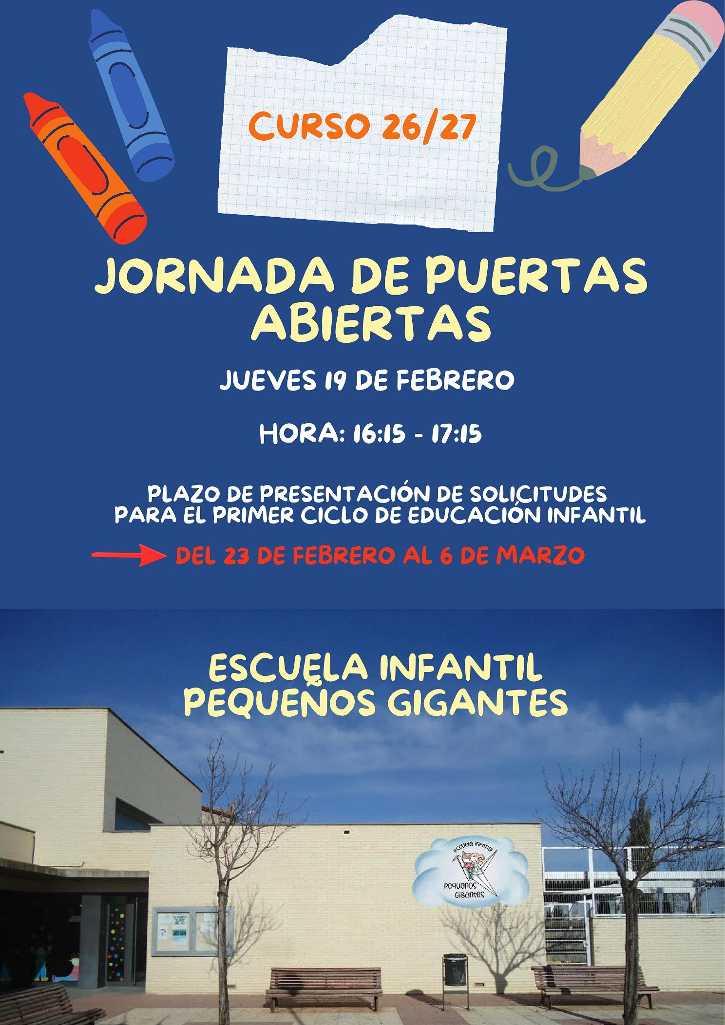 Hora: 16:15 - 17:15 PLAZO DE PRESENTACIÓN DE SOLICITUDES PARA EL PRIMER CICLO DE EDUCACIÓN INFANTIL: DEL 23 DE FEBRERO AL 6 DE MARZO