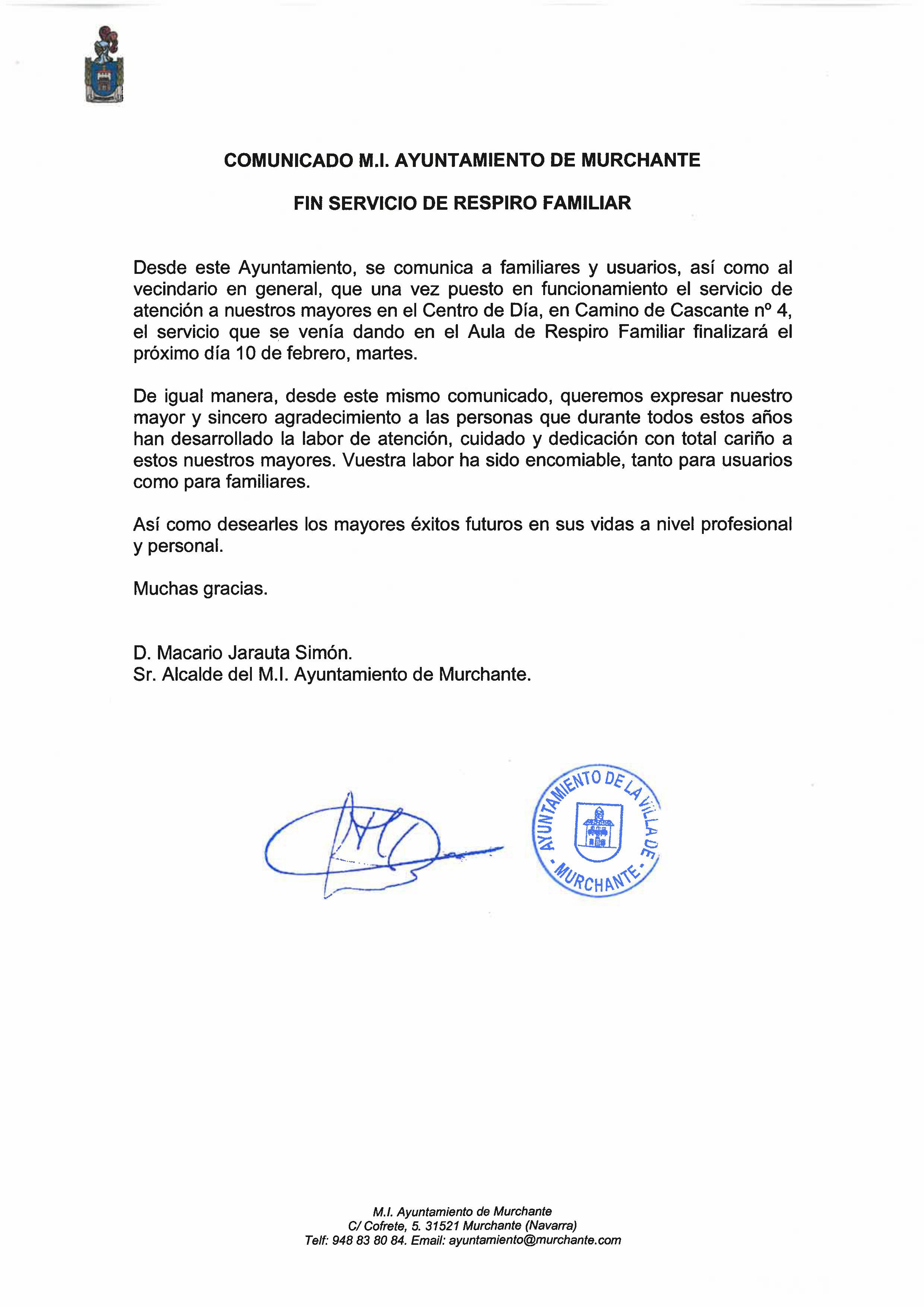 Desde este Ayuntamiento, se comunica a familiares y usuarios, así como al vecindario en general, que una vez puesto en funcionamiento el servicio de atención a nuestros mayores en el Centro de Día, en Camino de Cascante no 4, el servicio que se venía dando en el Aula de Respiro Familiar finalizará el próximo día 10 de febrero, martes.