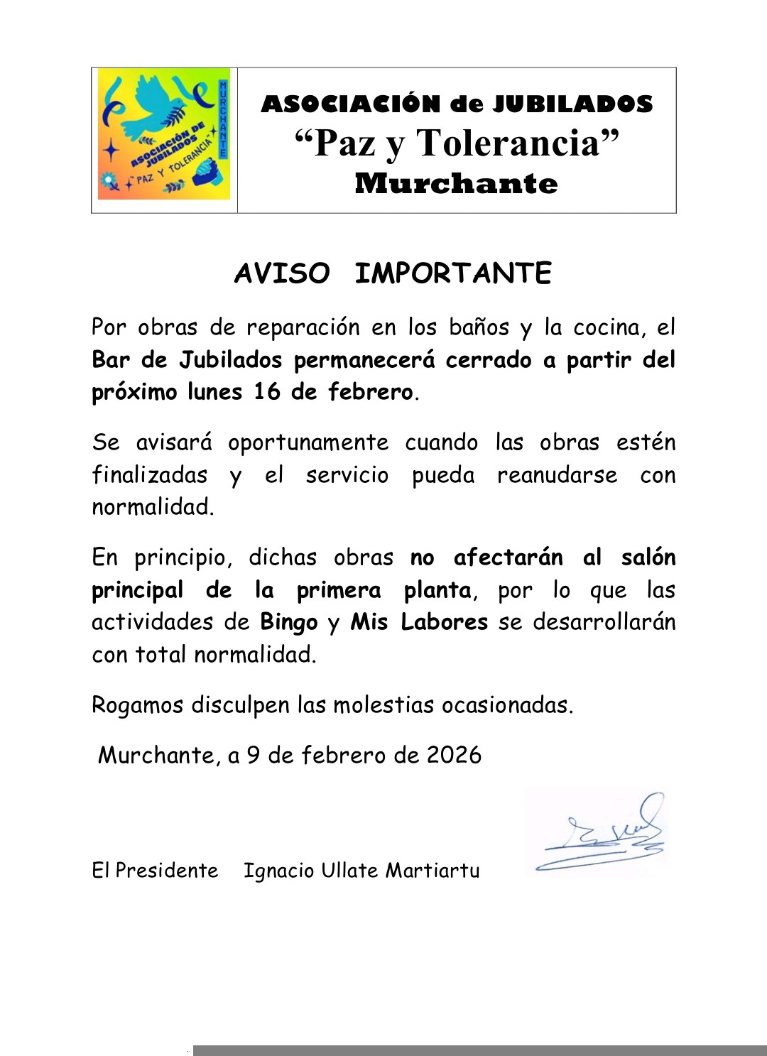 AVISO: CIERRE BAR JUBILADOS