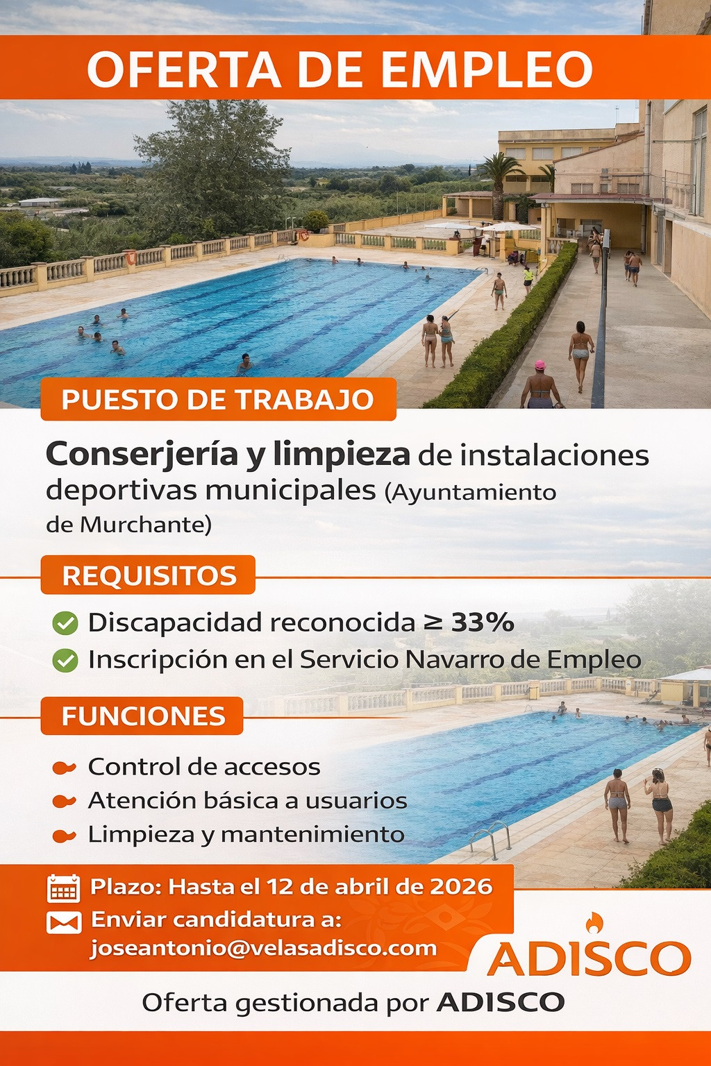 CONSERJERÍA Y LIMPIEZA INSTALACIONES DEPORTIVAS MUNICIPALES MURCHANTE. Inscripciones hasta el 12 de abril en joseantonio@velasadisco.com
